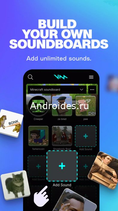 Стартовая библиотека насчитывает 500 000 звуковых эффектов, шаблонов и заготовок, разделенных на тематические категории. Сторонние разделы включают вирусные хиты, нишевые клипы, аниме-звуки и классические интернет-мемы. Ежедневно сообщество добавляет новый контент через встроенную систему публикации, обеспечивая беспрерывный процесс расширения каталога.