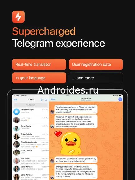 - Функции, отсутствующие в официальном клиенте: мгновенный перевод аудиосообщений в текст (без Premium-подписки), перевод сообщений в чате (включая всю историю сразу), дополнительные параметры приватности;