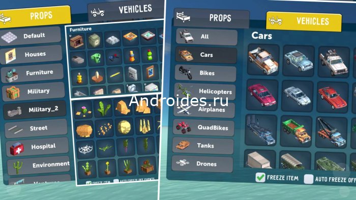 Вымышленная вселенная предлагает более 1000 предметов и коллекций: оружие, транспорт, дроны, танки, декоративные элементы. Предусмотрены разнообразные карт: готовые локации, а также возможность создавать собственные. Стиль – любой: горная местность, военные базы, космические станции.