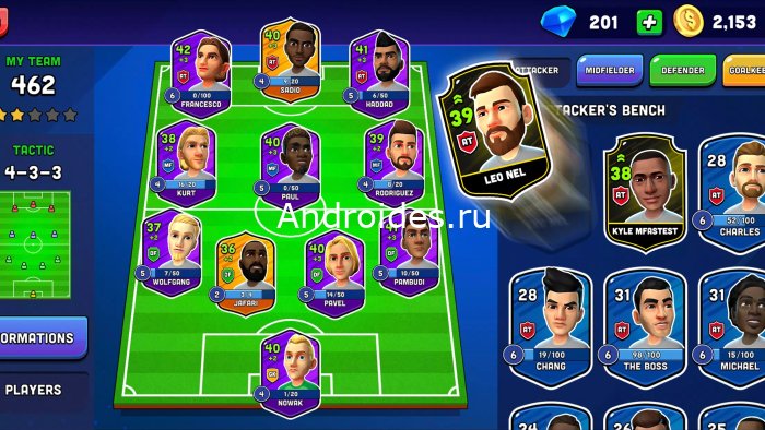 - Полноценная система развития команды: как и в FIFA, команды становятся сильнее с помощью карточек футболистов, выдаваемых за прохождение заданий или же приобретаемых в специальном магазине;