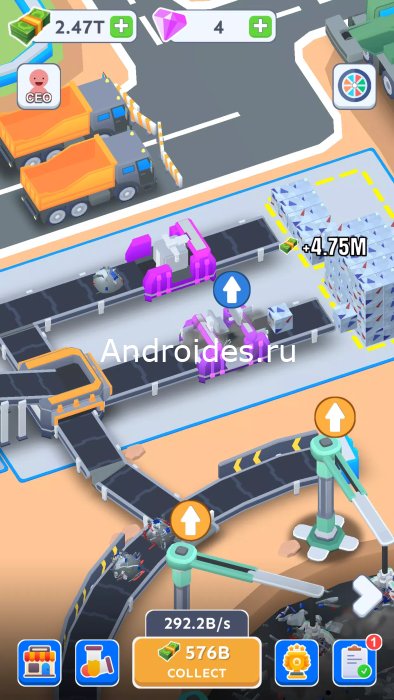Завод улучшается: оборудование апгрейдится, увеличивается эффективность переработки, открываются новые возможности, вроде продажи добытых изделий по завышенной цене. Прибыль же пригодится для проведения инвестиций, поиска новых заказов или же прохождения заданий повышенной сложности, которые меняются несколько раз в неделю.