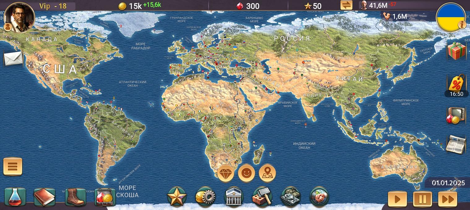 - Глобальный масштаб: возможность возглавить любую страну с учетом реального географического положения, культуры, доступных ресурсов;